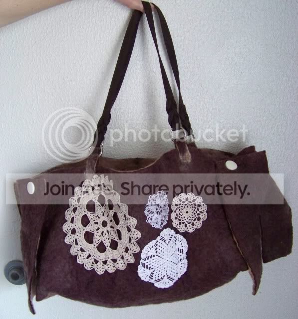 I made this no-sew bag in my 3D Fibers class. I made it with a process called wet felting. You start with raw fiber, usually wool, that's already cleaned and dyed. You basically just lay it out in sheets, wet it with soap and water, and agitate it until the fibers bond together. I made this bag with no structural sewing. I only sewed on the buttons and some of the lace.